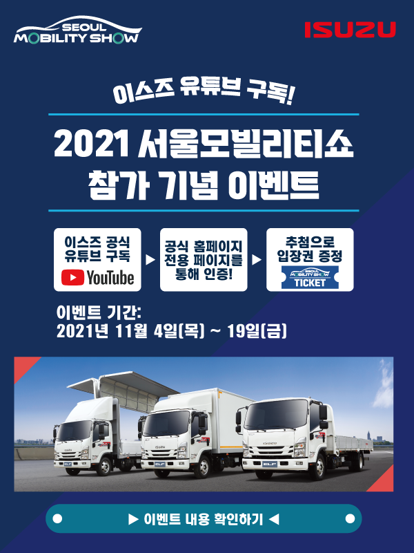 안녕하세요, 고객님. 11월25일(목) ~ 12월5일(일)에 일산 킨텍스에서 개최될 '2021 서울모빌리티쇼'에 이스즈가 유일한 상용차 브랜드로 참가하게 되었습니다. 이를 기념하여 '2021 서울모빌리티쇼 참가 기념 이벤트'를 진행합니다. 11월4일(목)부터 19일(금)까지 [이스즈 공식 유튜브채널 '이스즈 코리아']를 구독한 분들을 대상으로 추첨을 통해 서울모빌리티쇼 입장권을 250명에게 선물해 드립니다 (1인 2매). 유튜브채널을 구독하여 화면을 캡쳐 후, [응모 페이지]에 개인정보 기입 및 캡쳐화면을 업로드하여 제출 버튼을 누르시면 응모가 완료됩니다.