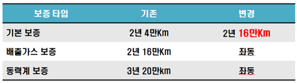 기본 보증 (차체 및 일반 부품의 보증)을 현재 2년 또는 4만km를 2년 또는 16만km로 연장하는 프로그램입니다. 2022년 하반기 부터 판매되고 있는 2023년식 차량부터 적용 되며 배출가스 보증 및 동력계통 보증 기간은 이전 동일하며, 이스즈 공식 서비스센터 유지관리 이력 보유 차량에 한합니다.