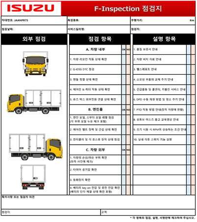 2022년 11월 1일부터 판매 차량에 대해 신차 출고 후 5개월 또는 1만km 전까지 선도래 차량에 한하여 3가지 '점검 항목'과 (차량 내부, 엔진룸, 차량 외부) 10가지 차량 관리에 필요한 '설명 항목'을 서비스하는 ISUZU만의 최초 점검 서비스 입니다.